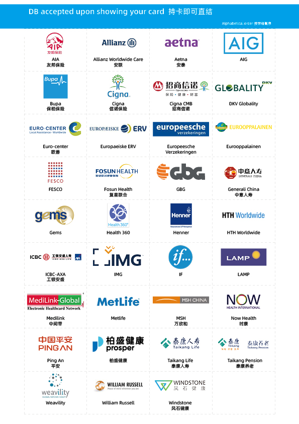 OASIS International Hospital has signed insurance direct payment agreements with many domestic and foreign insurance companies. You can call us or bring your health insurance card to our Information Desk for information about your personal benefits. The insurance companies we can pay directly include but are not limited to the following:"